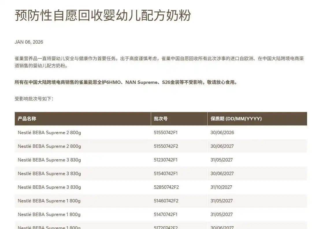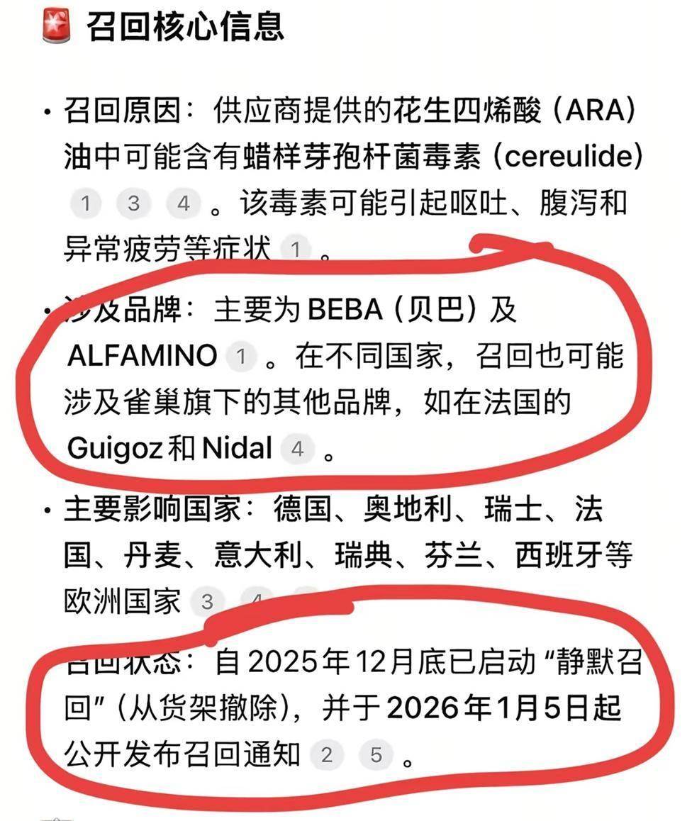 1月6日,很多父母正在睡前刷手机时看到了这条令惊的动静。QC公司,这家占领全球母婴货架半壁山河的食物巨头,颁布发表了一项防止性召回。而是涉及到可能风险婴长儿健康的毒素风险。按照荷兰食物取消费品平安局(NVWA)的传递,问题的泉源可逃溯到2024年12月。其时,QC位于荷兰努恩斯佩特的一家工场正在出产线上检测到了蜡样芽孢杆菌。虽然最后的产物检测并未发觉问题,但这个现患好像埋正在奶粉供应链中的按时,最终正在2026岁首年月。令全球父母严重的是,此次污染事务的“”并非奶粉从料,而是被普遍添加于婴长儿配方奶粉中的功能性成分——ARA(花生四烯酸)油脂。这种被称为“脑黄金”的成分,旨正在推进婴长儿大脑发育,却成为了此次全球召回事务的导火索。