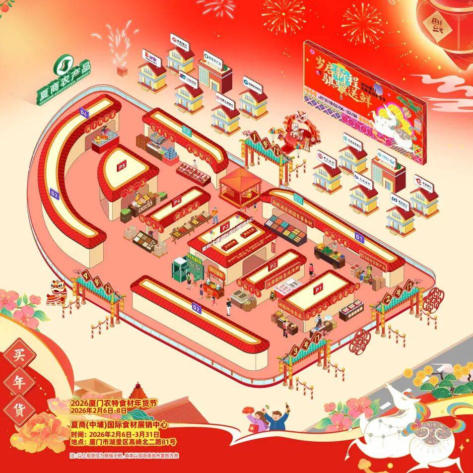 2月6日—2月8日,户外展位3天狂欢,夏商(中埔)国际食材展销核心(A 区)同步开业、全年“不落幕” 展销!250+户外展位、50+室内展位(A/B区)等实力集结,厂家曲供、产地曲采商户等同台表态,数千种全球农特食材近批发价发卖,一坐购齐优良好货,领略“舌尖上的年味”!温暖提醒:为进一步便亨通平易近采购,市场出格正在展销核心对面的P4买卖区,斥地果蔬白日买卖街,并将业态延长至肉、禽、蛋品等惠平易近平价买卖区。