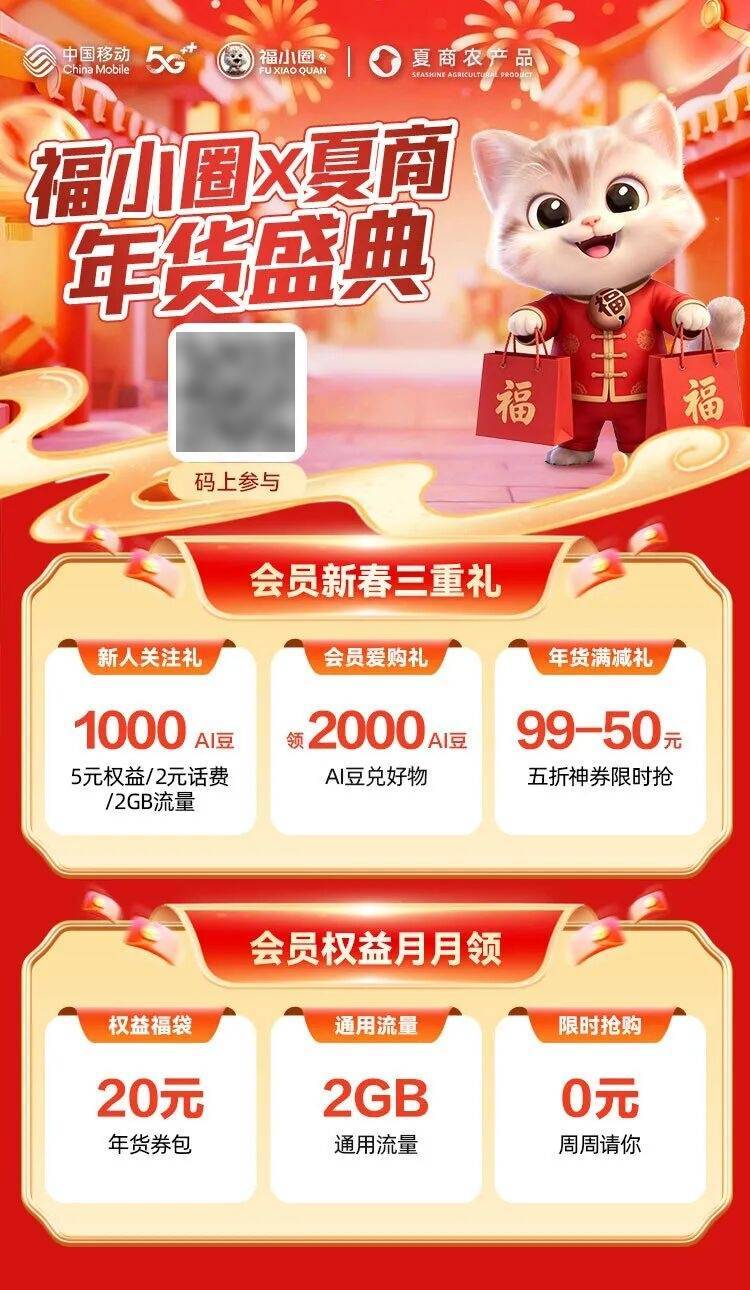 厦门挪动联袂夏商农产物配合打制年货盛典,推出福小圈PLUS糊口会员新春特惠及一系列优惠勾当。厦门挪动客户插手福小圈PLUS糊口会员,每月仅需10元,每月可领取价值20元起商超代金券(可正在年货节商户利用)、2GB通用流量、还可参取周周0元请你秒杀勾当。勾当期间福小圈会员到现场最高可享新春三沉礼:福建挪动客户初次关心福小圈号可获得新人关心礼、现场还无机会领取2000AI豆兑好物、更有福小圈线元满减券限时抢等你来参取!